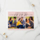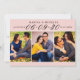 Estes casamento moderno e na moda salvam os cartões de anúncio de data incluem três fotos de noivado de 2 x 3" com a data apresentada no escrevendo elegante de roteiro. Personalize o texto da modelo da placa na frente e na parte traseira da placa para o seu grande dia. O fundo rosa claro e cor de texto preto pode ser personalizado para coordenar com o seu esquema de cor do casamento.