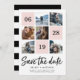 Anuncie seus próximos núpcias com esses cartões salve a data brancos cor-de-rosa e preto com seis de suas fotos quadrado favoritas e sua data de casamento em um layout nivelado. "Save the Date" (Salvar a data) aparece abaixo em um novo tipo de marcador de pincel de script manual casual. Personalize com seus nomes, local do casamento e site ou outras informações em preto rico. Cartões invertidos a faixas horizontais largas em preto e branco.