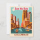 Cartão de convite para salvar a data de Columbus nas cores laranja e verde.