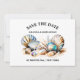 Um belo conteúdo gerativo ai design, com palmas e conchas periwinkle em tons iridescentes de marfim, bege, ouro falso, rosa e azul sobre a areia do mar e um fundo branco que tem modelos de fontes pretas editáveis. Este gráfico vibrante é ideal para praia, destino costeiro, náutico ou beachy vibe casamento, aniversário, chá de panela ou festa.