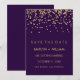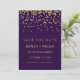 Os convites para salvar a data têm um fundo roxo intenso e rico e um visual moderno de confete dourado.