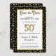 Salve a data para celebrar um aniversário de casamento de 50 anos. Que conquista! Tão digno de confetes. Veja nosso chuveiro de confetes de ouro falso em um fundo preto atrás de uma caixa de texto branca bordejada em ouro falso. Imagens de texto 'Save the Date' e '50º' em cor dourada são como 3D para um efeito WOW. No geral, um anúncio de 'Save the Date' muito elegante e simples para o seu grande evento.