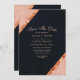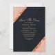 Copper Blush Rosa Azul Geométrico Salvar A Data Cartão. Este elegante design abstrato moderno apresenta rosa cor-de-rosa e azul naval acentuado com linhas de cobre em folha metálica falsa e confete.