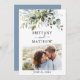 Anúncio de Noivado de Casamento com Molerce Botânico Moderno Elegante Aquarela Salva o Cartão de Data inclui folhas de eucalipto, folhagem botânica verde, folhas azuis empoeiradas e outras lindas culturas botânicas. Foto do casal. Pó Azul.