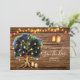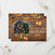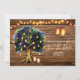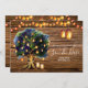 Uma ilustração maravilhosa e vibrante com um grande carvalho repleto de falsas lanternas suspensas e luzes de cordas contra um fundo castanho de madeira falsa. As bordas superior e inferior têm cestos de ratos mais velozes ovais que são iluminados contra o pano de fundo do ouro. Folhas verdes pequenas estão espalhadas abaixo da árvore e modelos brancos aparecem à direita para seus detalhes personalizados. Estes são ideais para a queda do país rústico/anúncios de outono, verão, primavera ou inverno "salve a data". Essas cartas chatas luxuosas e elegantes vão deliciar seus convidados.