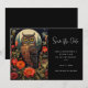 Salve o cartão de data com uma coruja legal com um olhar piercing. Uma lua de cheio nas costas com um jardim de flores vermelhas.