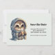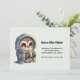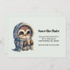 Salve o cartão de encontro com uma ilustração fofa de uma coruja fofa em um roupão de inverno e cachecol segurando um café quente.
