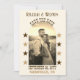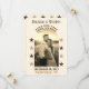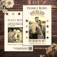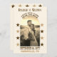 Um casamento no estilo country music salve a data em tons sepia com sua foto na frente em forma de arco cercado por estrelas. Na moda para os seus nomes e a inscrição ocidental clássica do país para "salvar a data" e a data do seu casamento. Este moderno salvará a data com um sentimento de vintage irá abater seus convidados. No verso da placa há outra foto, mais estrelas e espaço para uma mensagem adicional. Há também um código QR e uma versão de texto do seu site de casamento. Todo o texto é personalizado por você. As cores podem ser personalizadas na Ferramenta Design.