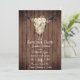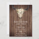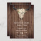 Este boho rústico Salve o anúncio do casamento da Data mostra um crânio de vaca floral em um fundo de madeira de galinha. -