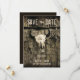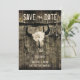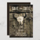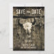 Casamento russo do crânio de vaca do touro ocidental com chifres, estilo vintage salvar o cartão plano de anúncio de data. Textura de madeira de grunge rancho. Cowboy inspirou design. Fotografia com direitos autorais Marg Seregelyi.