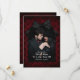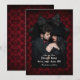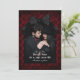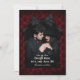 Deixe seus futuros convidados de casamento saberem que você está se casando e que deseja que eles guardem a data para o seu casamento gótico. Personalize o cartão de "save the date" com uma foto romântica do casal feliz dentro de uma lápide adornada com um laço preto contra um padrão damasco de caveiras pretas em um fundo vermelho profundo. Seus nomes e a data do casamento são escritos em uma fonte gótica que se encaixa perfeitamente no tema de romance sombrio para o seu casamento gótico!