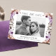 Anuncie sua data de casamento com nossa na moda e foto moderna, salve o cartão de data. O design apresenta a sua foto de noivado no meio, enquadrada por uma borda de cristais de aquarela pintados em tons de roxo e rosa. "Salvar a data" é exibido no topo em uma fonte preta moderna do servidor. Personalize o cartão de data exclusivo, adicionando sua foto, nomes, data de casamento e local do casamento. A placa se inverte para exibir um plano de fundo de aquarela roxo bonito.