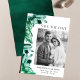 Anuncie sua data de casamento com nossa na moda e foto moderna, salve o cartão de data. O design apresenta uma borda de cristais de aquarela pintados em tons de verde esmeralda. "Salvar a Data" é exibido em uma fonte preta moderna do serif. Personalize o cartão de data exclusivo, adicionando sua foto, nomes, data de casamento e local do casamento. A carta se inverte para exibir um belo fundo verde-d'água esmeralda.