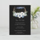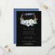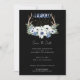 Este convite de casamento Boho apresenta fases de crista e lua de cheio com flores brancas e azuis, pontos de aglomerado de cristal de ouro, verde de inverno e galhadas. Uma escolha perfeita para uma união espiritual mística ou metafísica, para um aperto de mão ou para um casamento no inverno. As cores e fontes de fundo podem ser facilmente alteradas para corresponder às suas necessidades.