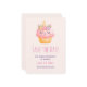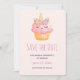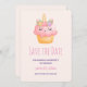 Salve o cartão de data com um desenho de aquarela de um cupcake com cobertura cor-de-rosa, um chifre unicórnio e rosas coloridos.