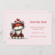 Save the date card with a whimsical drawing featuring a big orange red kitty cat.