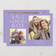Simple and modern wedding save our date card featuring a text that says "Save Our Date" with hearts. 2 photos on the front and one on the back. The background is lilac.