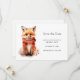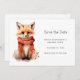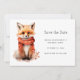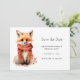 Save the date card with an illustration of a reddish orange fox pup. A subtle smile on his face. Wearing a nice red scarf for warmth.