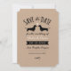 Dachshund silhuettes com coração no estilo kraft. É divertido guardar o anúncio de data para amantes de cachorros. Personalize este convite original de casamento com o nome do casal feliz e a data do casamento. Visite o Doodle World, de Jenn, para obter ainda mais produtos de planejamento de casamento que incluem este design de cachorros-frade e mais convites para casamento de raças caninas.