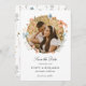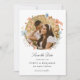 Este casamento de flores selvagens e coloridas Salve o Cartão de Datas é perfeito para um próximo casamento russo. O design apresenta uma fotografia do casal feliz enquadrada numa coroa de flor silvestre pintada manualmente com belos florais vermelhos, pincéis, laranja, azul, amarelo e verde minúsculos. O elegante modelo de casamento é fácil de personalizar usando o modelo fornecido.