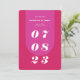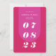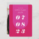 O nosso cartão de salvamento do casamento, ao estilo retrógrado, mínimo e ousado, é perfeito para o casal da moda que ama se destacar e fazer uma declaração ousada. Nosso design apresenta uma combinação de cores rosa-magenta brilhante e ousada. Uma forma simples de abstrato, cria uma aparência ousada com a data do casamento mostrada ousadamente em caracteres brancos grandes. O verso apresenta um layout de foto do cheio com um monograma em negrito e um endereço de site de casamento do casal opcional. Projetado por Papelaria de Moodthologia