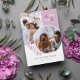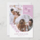 Cartão de data de salvamento frente e verso em branco e roxo com suas iniciais, fotos sobrepostas e folhagem com fontes limpas e elegantes. Cartão de data de salvamento de foto com design moderno personalizado com seu monograma e fotos, dois de um lado e um do outro.