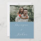 Anuncie seu dia especial em estilo com esta foto azul empoeirada salve o cartão de data. Apresentando um layout moderno, fundo pastel suave e uma fonte elegante de script, é a maneira perfeita de compartilhar seu entusiasmo com a família e os amigos. Personalize com sua foto de noivado, nomes e detalhes de casamento favoritos para criar uma marca de seleção pessoal que dê o tom para sua celebração. Ideal para primavera e casamentos de verão, este design emparelha maravilhosamente com papelaria de casamento azul empoeirada.