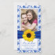Febre de girassol amarela, azul real e branco floral, casamento com foto de damascos florais salvo o cartão de data de lançamento. Um belo casamento de fotos com temas azuis e amarelos salve a data. A flor neste casamento fotográfico, exceto a data, é um girassol amarelo brilhante. Para alterar o texto e a foto, use as opções personalizar. Para fazer outras alterações, use a ferramenta de personalização do Zazzle. NOTA: Este convite é um design sem nenhum embelezamento 3D.