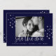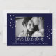 Este elegante casamento salve o cartão de data apresenta tipografia moderna, escrita prateada e sotaques com sua foto pessoal favorita, num fundo azul escuro e marinho.
