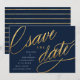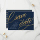 Esses save the dates modernos e únicos apresentam uma tipografia sofisticada em um efeito de folha de ouro falso sobre um fundo azul marinho escuro, com os detalhes do anúncio do casamento em branco. A parte de trás apresenta um padrão de listras azul marinho e dourado trendy. Altere a cor do fundo usando a ferramenta "Personalizar"!