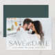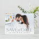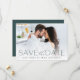 Anuncie sua data de casamento em estilo inesquecível com esses cartões salve a data elegantes e modernos, com uma foto horizontal ou paisagística de cheio com "salve a data" sobreposta em letras verdes ricas na floresta ao longo do fundo. Seus nomes, data do casamento e local do casamento aparecem em letras modernas. Personalize as costas com detalhes adicionais, como o seu site de casamento.