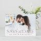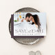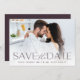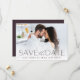 Anuncie sua data de casamento em estilo inesquecível com esses cartões salve a data de fotos elegantes e modernos, com uma foto horizontal ou paisagística de cheio com "salve a data" sobreposta em letras ricas em ameixa ao longo do fundo. Seus nomes, data do casamento e local do casamento aparecem em letras modernas. Personalize as costas com detalhes adicionais, como o seu site de casamento.