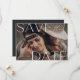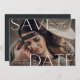 Anuncie sua data de casamento em estilo inesquecível com esses cartões salve a data elegantes e modernos, com uma foto horizontal ou paisagística de cheio com "salvar a data" sobreposta em letras brancas nos cantos. Sua data de casamento aparece dentro da letra D, com seus nomes e local de casamento junto. Personalize as costas com detalhes adicionais, como o seu site de casamento.