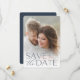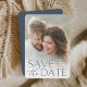 Anuncie sua data de casamento em estilo inesquecível com esses cartões salve a data elegantes e modernos, com uma foto vertical ou retrópica de cheio com "salve a data", sobreposta em letras azuis de ardósia ao longo do fundo. Seus nomes, data do casamento e local do casamento aparecem junto com a letra moderna. Personalize as costas com detalhes adicionais, como o seu site de casamento.