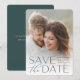 Anuncie sua data de casamento em estilo inesquecível com esses cartões salve a data elegantes e modernos, com uma foto vertical ou retrópica de cheio com "salve a data" sobreposta em letras verdes na floresta ao longo do fundo. Seus nomes, data do casamento e local do casamento aparecem junto com a letra moderna. Personalize as costas com detalhes adicionais, como o seu site de casamento.