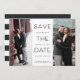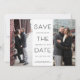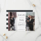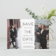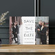 Moderno salve a data cartão com fotos recursos sans serif e itálico em letras ricas fora de preto, com seus nomes, data de casamento e local intercalados com "salve a data". O texto está centrado em um fundo branco nítido que descreve duas de suas fotos favoritas de noivado vertical ou orientado a retratos. Personalize com suas informações de convite e/ou site de casamento na parte inferior. Um chic salva a escolha da data para casais modernos com uma estética minimalista.