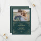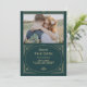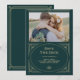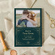 Convites de casamento com um toque glamoroso apresentam uma releitura moderna do clássico art déco. Uma moldura geométrica ornamentada com aparência de champagne dourado falso e ornamentação decoram um fundo verde esmeralda elegante com a sua foto pessoal favorita para um visual de casamento dramático e vintage.