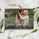 Um cartão de data moderno, projetado para acomodar sua foto favorita de noivado de sangramento horizontal ou orientada a paisagem. "Save the date" (Salvar a data) aparece como uma sobreposição de texto de folha de papel dourada em letra casual manuscrita. Personalize com seus nomes, data do casamento e local do casamento embaixo em letras brancas, e adicione seu site de casamento ou detalhes adicionais no verso.