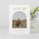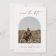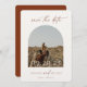 Desert Siena Modern Minimalista, casamento salve o cartão com fotos. Foto do quadro de arco do solteiro, siena queimada e tipografia de cor bege arenoso branco com cores de fundo correspondentes.