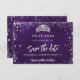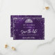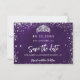 Um glamouroso cartão Save the Date para uma doce 16, 16 festa de aniversário. Um fundo púrpura incolor. Decorado com faíscas de brilho prateado e uma tiara. O texto: Salvar a Data é gravado com um script de estilo com letra de tendência grande.
