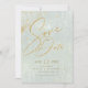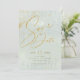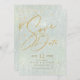 Um fundo de aquarela em tons de verde sábio é tocado por um abstrato de linhas de ouro finas e efeitos de iluminação reluzentes para criar as peças desta bela suíte de casamento. O cartão 'Salvar a Data' do casamento mostrado aqui também apresenta texto baixo, centralizado e caligrafia elegante. Adicione facilmente seus próprios nomes, data de casamento e informações usando o modelo fornecido. Procure ID867 para ver outras peças e opções de cores para este conjunto.