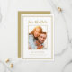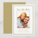 Este cartão de save-the-date com foto dourada e branca apresenta uma moldura moderna de borda dupla em torno da foto do noivado para uma apresentação limpa e elegante. A caligrafia em cor dourada adiciona um toque sofisticado em um fundo branco nítido, e a parte de trás do cartão é finalizada em dourado sólido para uma aparência coordenada. Este layout de retrato funciona lindamente com fotos em close-up ou de corpo inteiro. Personalize com os detalhes do seu casamento e sinta-se à vontade para entrar em contato para pedidos personalizados.