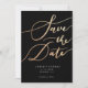 Elegante e simples cartão de salvar a data de casamento. O texto de tipografia escrito à mão é em brilho dourado falso contra um fundo preto.