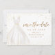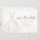 Os cartões salve a data de chás de panela elegantes apresentam um vestido de casamento branco com cor d'água com brilho dourado brilhante, salve o script de data.