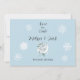 Um pequeno dragão branco senta-se entre rosas brancas contra um fundo azul-claro suave com flocos de neve delicados.