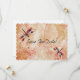 Esta Dragonfly Save The Date apresenta libélulas de cor d'água vermelha em um plano de visão de vintage com designs florescentes e giratórios.
