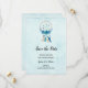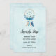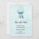 Salve o cartão de data com uma coletora de sondas bonito. Cor azul, turquesa e creme. Decorados com penas, miçangas e flores.