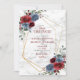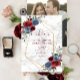 Moderno e moderno, este bonito casamento Save the Date card design apresenta inscrições à mão rústicas, uma geométrica dourada amarela suja embelezada com azul empoeirado, rosas e flores de cor vermelha entorpecida, sobre uma textura falsa de mármore Carrera. A parte traseira da placa apresenta sua foto favorita do noivado. Parte de uma suíte de casamento. Copyright Elegant Invites, todos os direitos reservados.