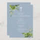 Este elegante eucalipto verde botânico empoeirado azul, primeira comunhão sagrada, exceto o convite de data, pode ser personalizado com suas informações em tipografia quic com iniciais de monograma no verso. Projetado por Thisnotme©