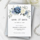 Casamento floral azul empoeirado salve o cartão de data com buquê elegante de azul marinho, azul real, branco, marfim de champanhe, rosa de cor esbranquiçada, botões de flor ranunculus e folhas de eucalipto verdes sábias e boquet elegante de aquarela. Entre em contato comigo para obter ajuda sobre a personalização ou se você precisar de outro produto com este design.